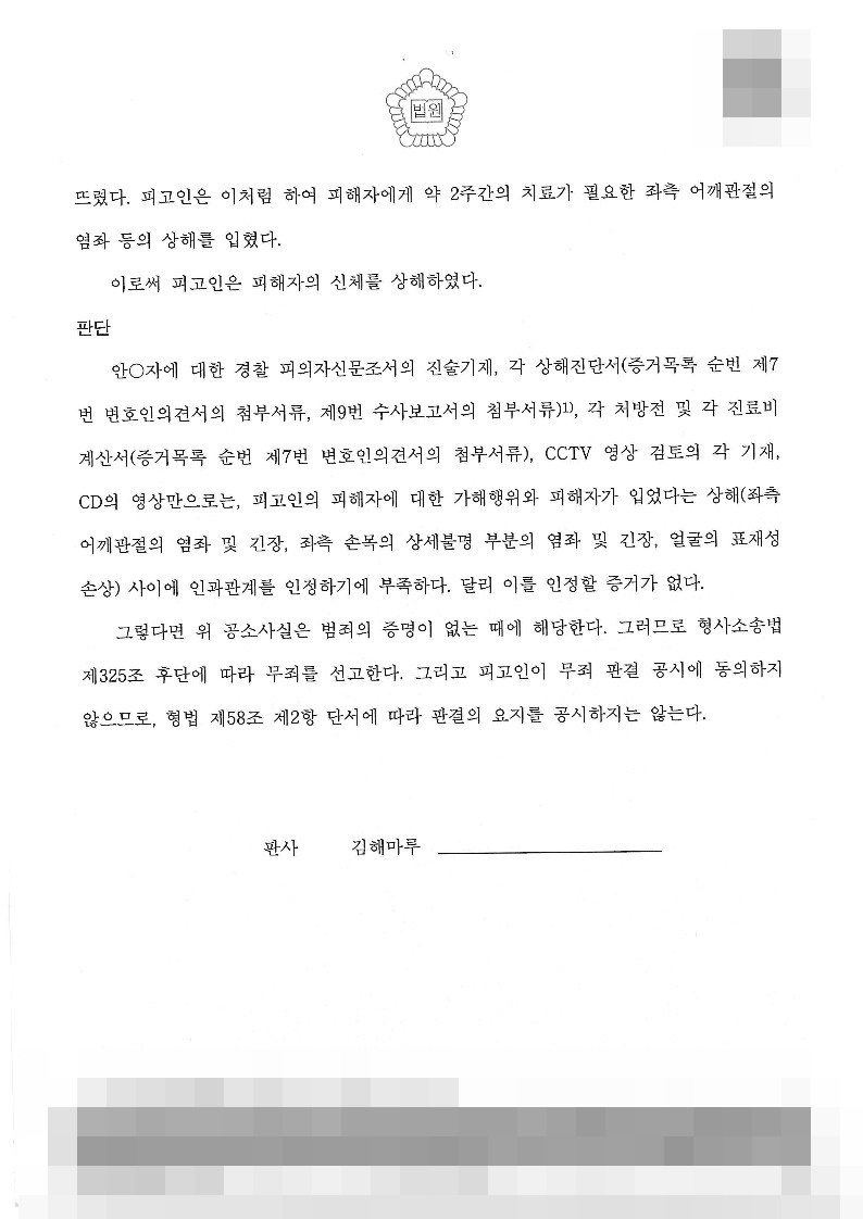 결국 재판부는 이러한 변호인의 주장을 받아들여 결국 피고인의 피해자에 대한 가해행위와 피해자가 입었다는 상해 사이에 인과관계를 인정하기에 부족하다고 판시하면서 피고인에게 무죄를 선고하였고, 피고인은 오랜 법정 다툼 끝에 자신의 억울함을 풀고 일상으로 복귀할 수 있었습니다.