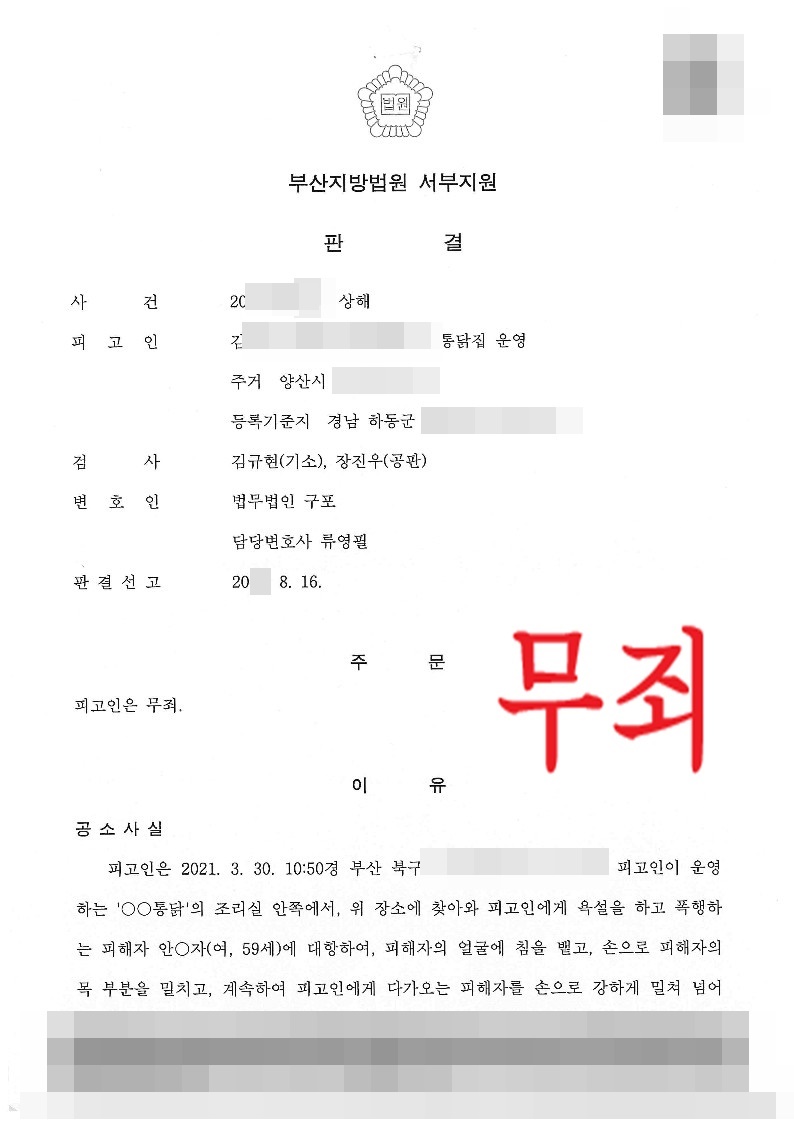 특히 법무법인 구포 담당변호인은 CCTV 영상과 피해자가 제출한 진단서의 각 기재, 그리고 피해자의 진술에 비추어 보더라도 피해자가 주장하는 상해부위가 피고인의 가해행위와는 관련이 없고, 오히려 피해자의 폭행행위 과정에서 스스로 입은 상처일 가능성이 있다는 점을 끈질기게 설득하였습니다.