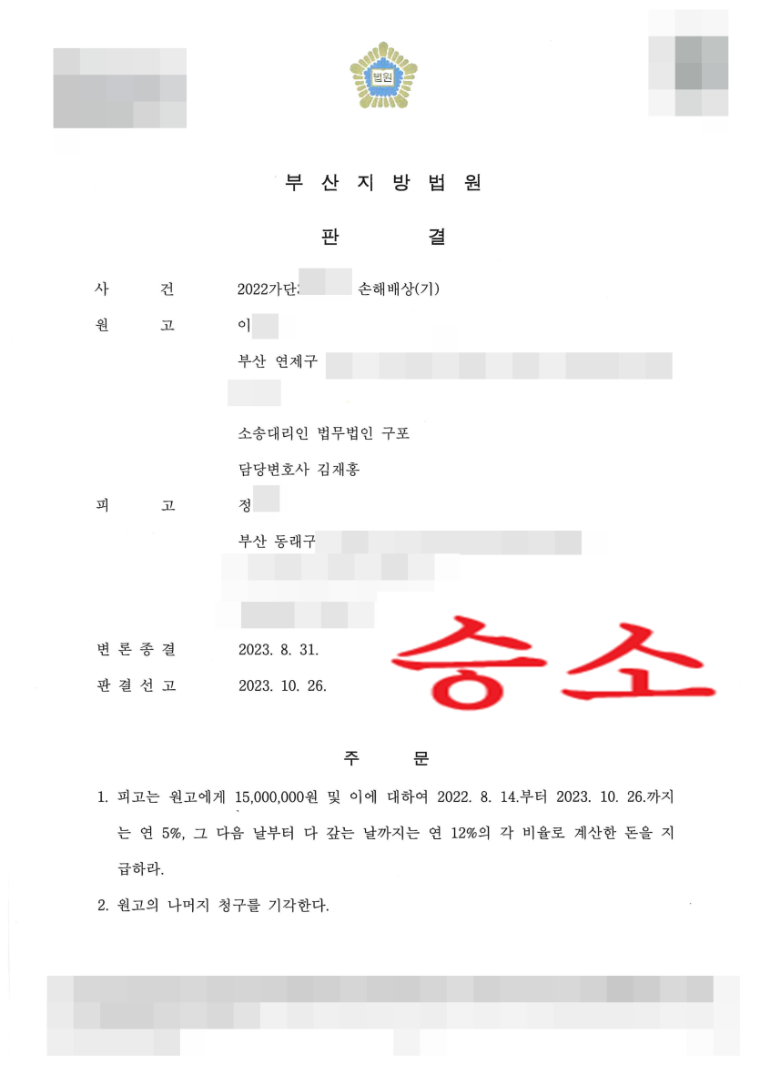이에 대하여 법무법인 구포 담당변호사는 제출한 입증자료를 토대로 상식적인 선에서 판단하더라도 피고의 주장은 허위임을 집중적으로 변론하였고, 그 결과 재판부는 피고의 주장을 배척하고 원고의 주장을 받아들여 원고에게 1500만원을 지급하라는 판결을 선고하였습니다.