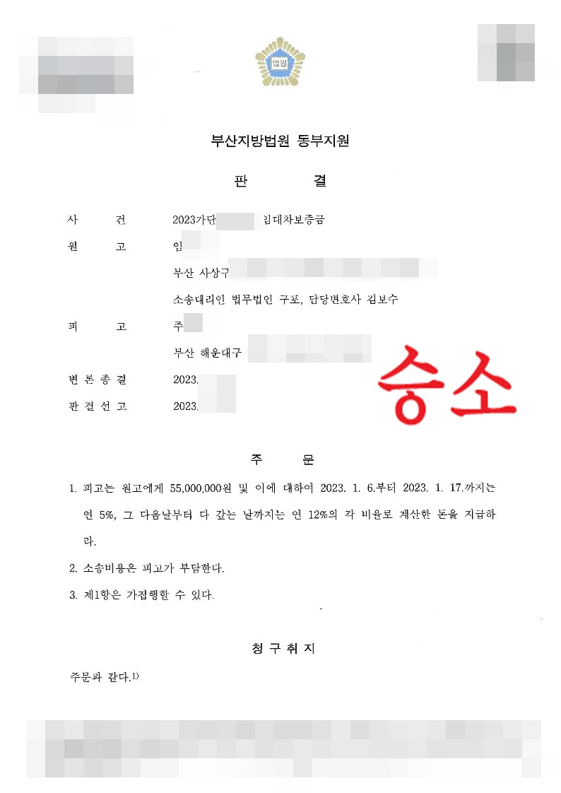 법무법인 구포 담당변호사의 주장을 받아들인 법원은 임대인에 대하여 5,500만원 전액 및 이에 대한 이자를 지급하라는 판결을 하였으며 의뢰인은 보증금을 돌려받을 수 있게 되었습니다.