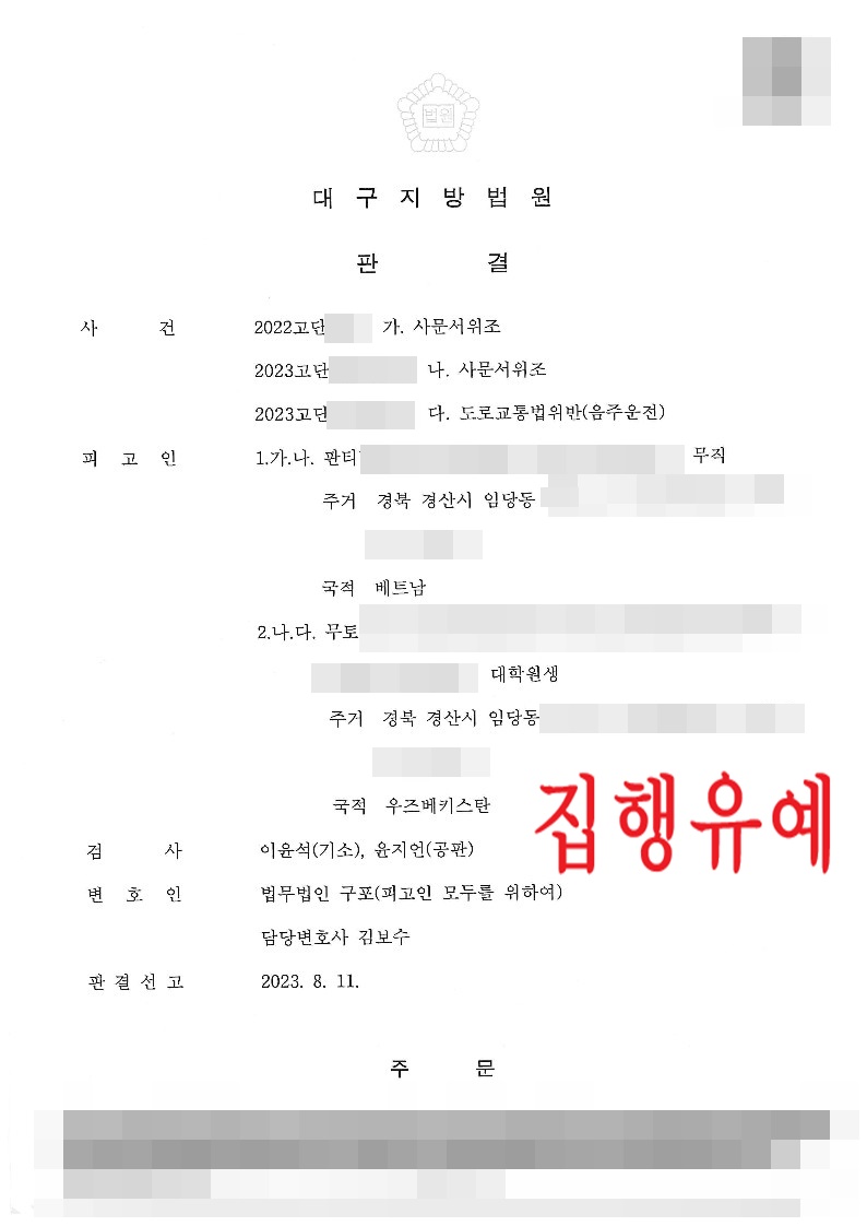 법무법인 구포의 주장을 받아들인 재판부는 의뢰인들에게 각 징역형의 집행유예를 선고하였고, 의뢰인들은 구속을 벗어날 수 있었습니다.