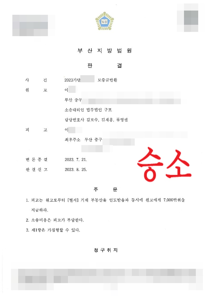 법무법인 구포 담당변호인의 주장을 받아들인 재판부는 임대인에게 의뢰인으로부터 오피스텔을 인도받음과 동시에 보증금을 반환하라는 판결을 내려 의뢰인은 불측의 손해를 예방할 수 있었습니다.