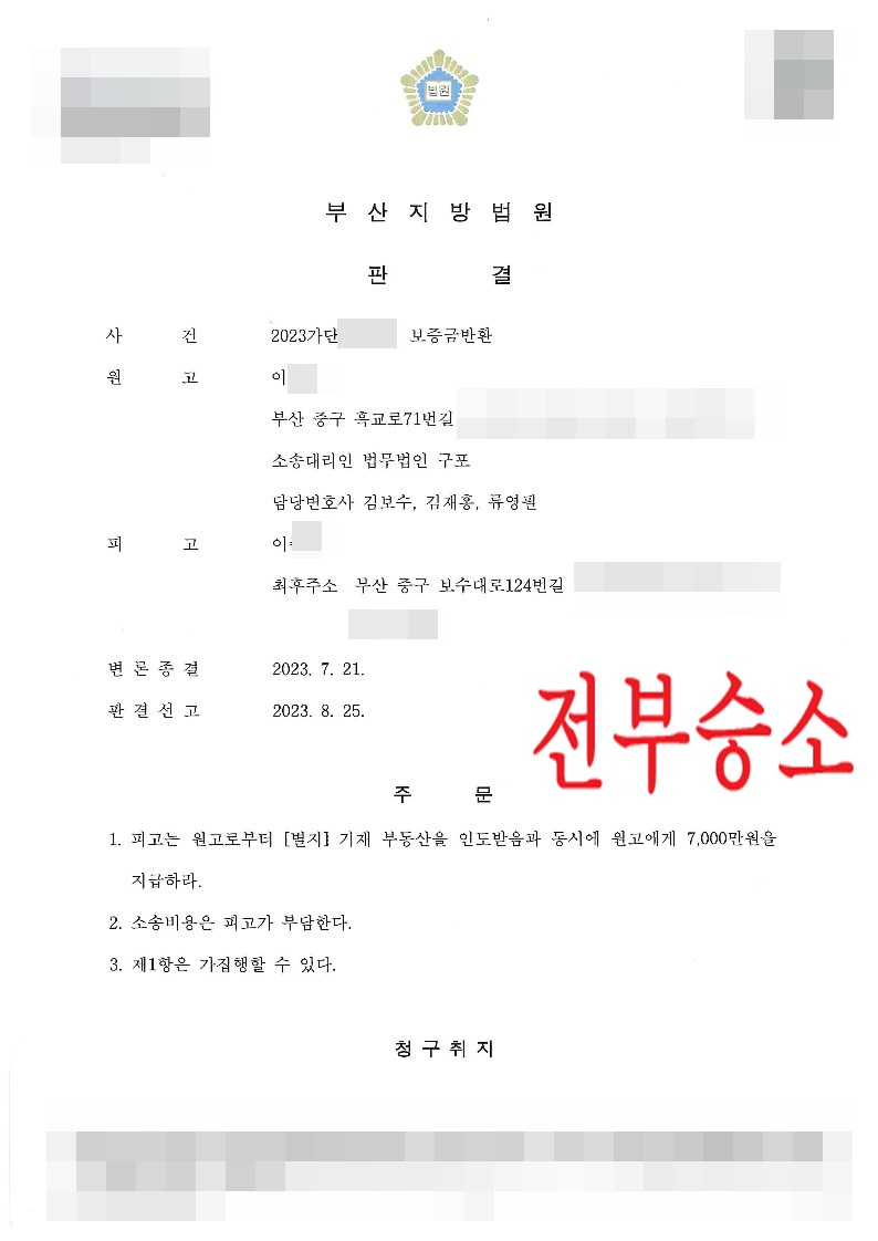 법무법인 구포 담담변호사의 주장을 받아들인 재판부는 임대인에게 의뢰인으로부터 오피스텔을 인도받음과 동시에 보증금을 반환하라는 판결을 내려 의뢰인은 불측의 손해를 예방할 수 있었습니다.