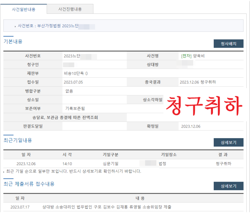 그러자 청구인(남편)은 더 이상 승소가능성이 없다는 사실을 깨닫고는 청구를 취하하였고, 이로써 의뢰인은 부당한 양육비 지급의 위험에서 벗어날 수 있었습니다.