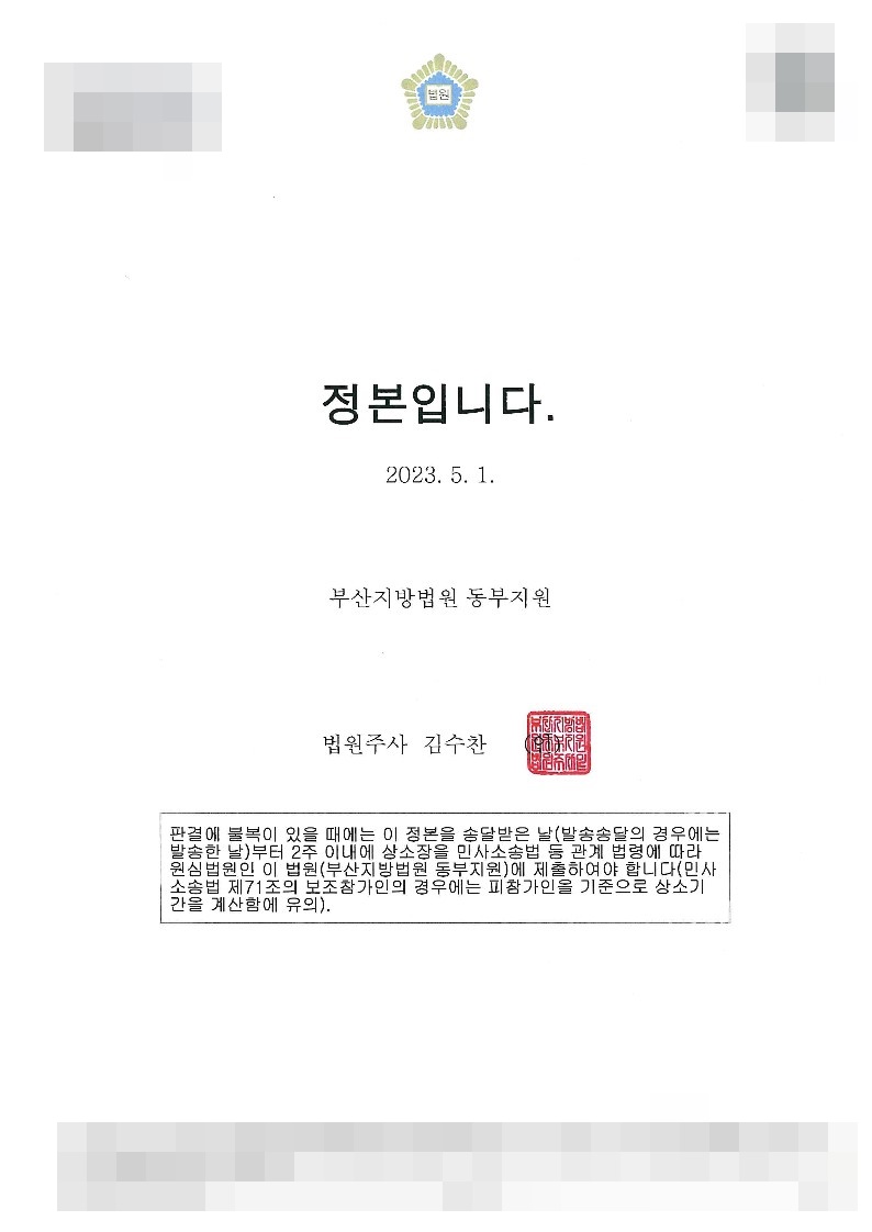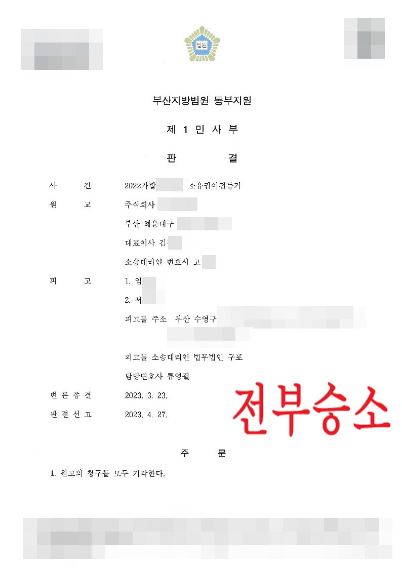 이에 원고는 항소를 제기하였으나 본 법무법인 구포는 위 1심 판결문에 기해 위 부동산에 설정된 가처분에 관한 가처분취소결정을 받아 가처분등기를 말소시킬 수 있었고 피고의 재산권 행사가 가능할 수 있도록 조력하여 주었던 사건입니다.