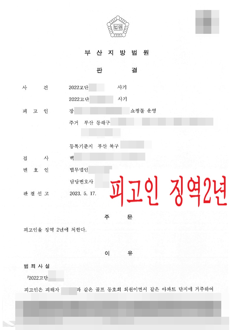법무법인 구포의 주장을 받아들인 재판부는 피고인에게 징역 2년을 선고했으며, 피고인은 법정구속 되었습니다.