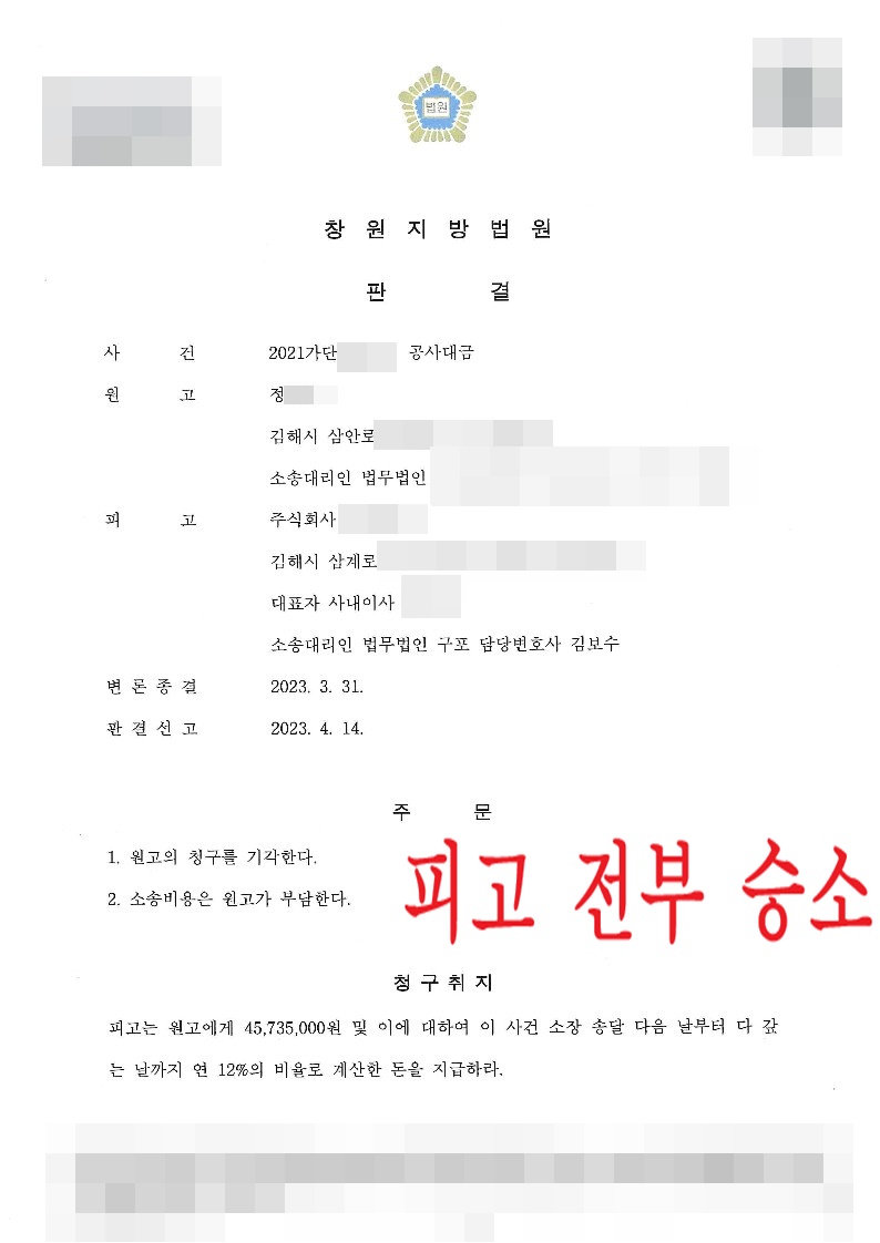 법무법인 구포의 주장을 받아들인 재판부는 원고 패소(피고 전부 승소) 판결을 하였습니다.