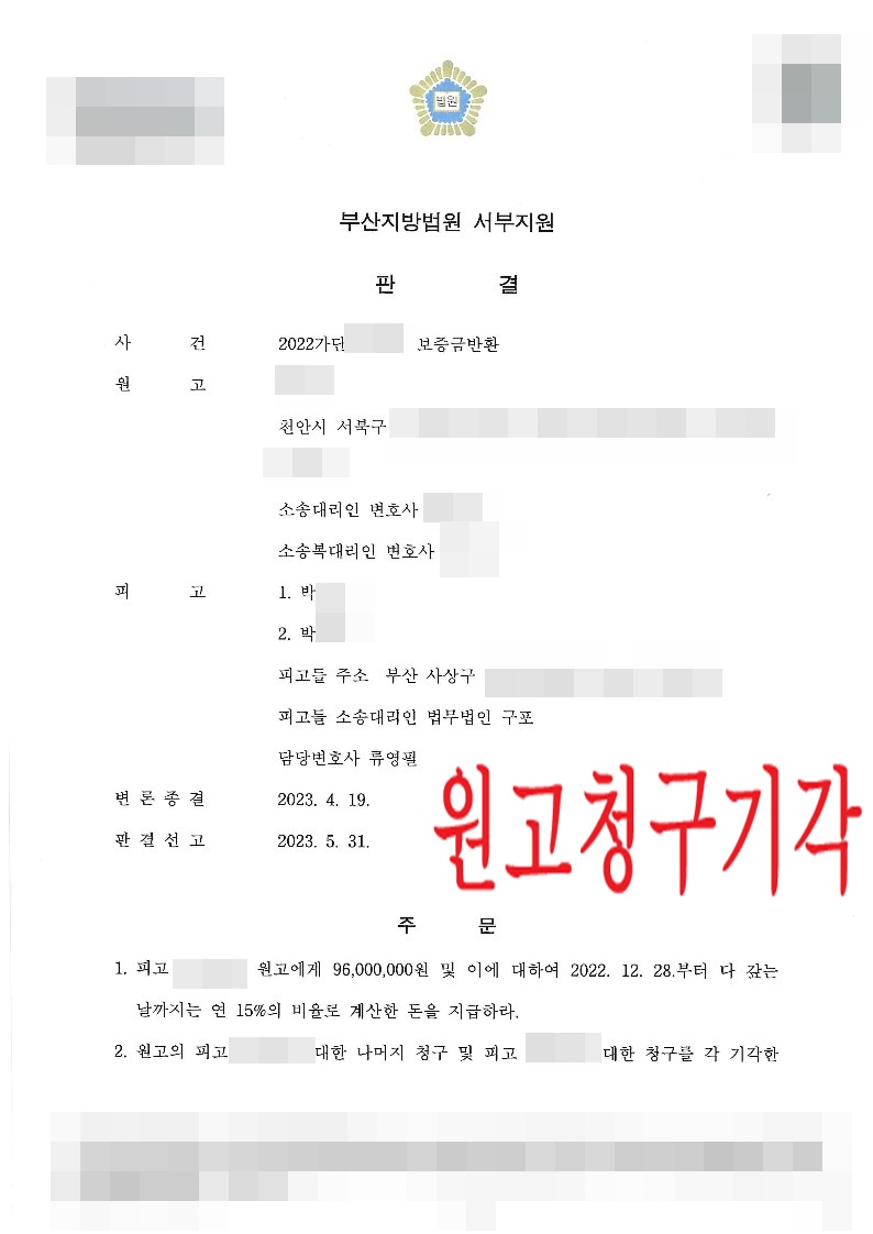 본 법무법인 구포 담당 변호사는, 위 아파트의 소유자 겸 임대인은 등기부에 기재되어 있는 것처럼 피고2가 아닌 피고1인 사실, 원고와 피고1이 이 사건 임대차계약을 체결할 당시 선 순위 근저당권이 설정되어 있어 원고도 이러한 사실을 이미 잘 알고 계약에 응하였는 바 피고1 및 피고2의 기망사실이 없었던 점, 피고1이 위 아파트를 제3자에게 매매할 당시 매매대금에서 원고의 보증금 중 일부만을 반환하기로 약속하고 원고가 위 임차건물을 피고1에게 인도하여 준 사실, 피고1은 실제 아파트 매각대금 중 일부를 원고에게 지급하고 이후 나머지 대금에 대한 공정증서를 작성하여 그에 따라 이자를 지급하고 원고도 변제기를 유예하여 준 사실 등을 입증하여 피고2에게 위 공정증서에 따른 책임이 없음을 인정받았고(원고청구기각) 피고1에 대해서는 원고가 주장한 지연손해금 주장 중 1년 상당의 지연손해금은 지급하지 않아도 된다는 판결을 받아 피고1, 피고2 모두에게 만족스러운 결과를 제공할 수 있었습니다.