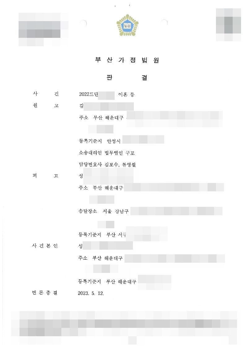 재판부는 법무법인 구포의 주장을 받아들여 의뢰인의 배우자를 유책배우자로 판단, 의뢰인에게 위자료 및 재산분할 가액, 양육비 등을 지급하라는 판결을 내렸습니다.