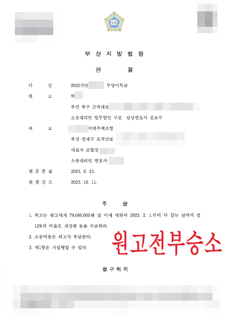 [민사] 지역주택조합탈퇴(지주택탈퇴) - 부당이득금(원고전부승소)