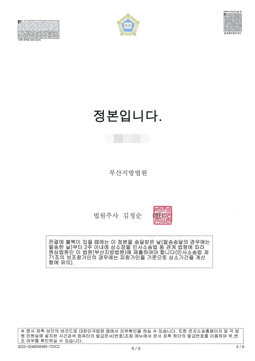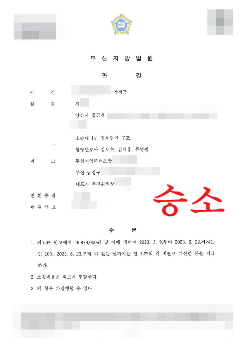 이렇게 1심 판결이 선고되었음에도 조합은 끝내 판결금을 지급하지 않았고, 이에 법무법인 구포 변호사는 원고와 상의하여 피고 조합 소유의 재산에 강제집행을 하는 등 집행절차까지 거친 끝에 비로소 조합으로부터 판결금 및 이자 상당의 금원을 지급받을 수 있었습니다.
