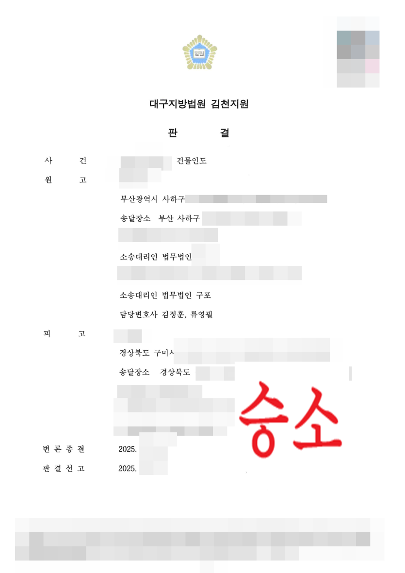 의뢰인이 여러 차례 요청해 보았으나 친척은 퇴거하지 않았고, 결국 의뢰인은 친척의 퇴거를 위해 건물 인도 소송을 제기하기에 이르렀습니다.