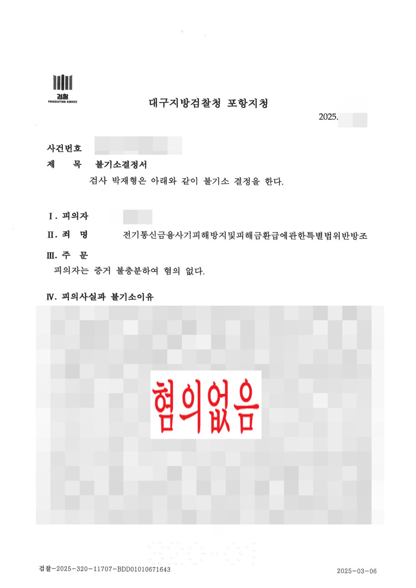[형사] 보이스피싱(전기통신금융사기피해방지및환급에관한특별위반 - 불기소