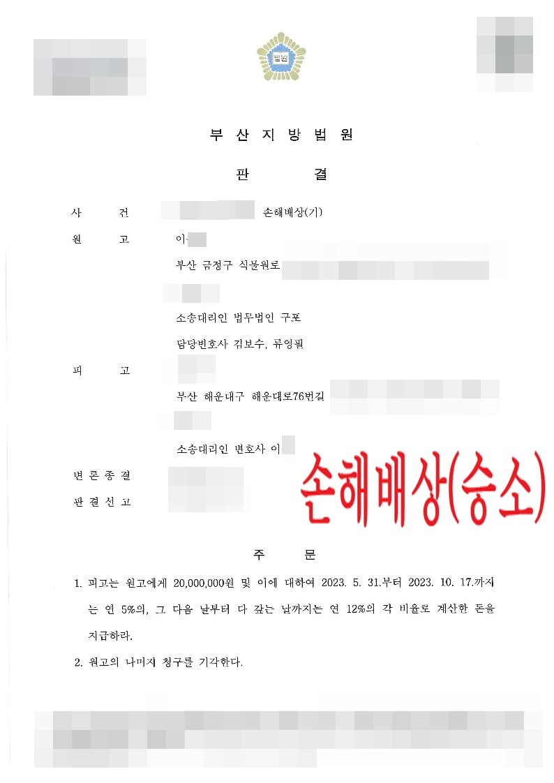 법무법인 구포 담당변호사는 의뢰인과의 충분한 인터뷰를 통해 사실관계를 확인하고, 관련 증거와 위 사실관계를 바탕으로 손해배상 청구의 소송을 대리하였습니다.