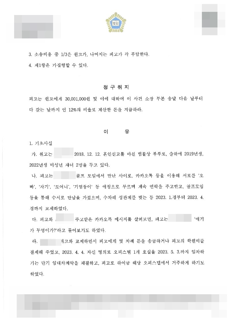 그러나 외도 상대방인 피고(상간녀)는 차마 용서 할 수 없었고, 이에 이른바 상간녀 소송(손해배상 청구의 소)을 제기하게 된 사안입니다.