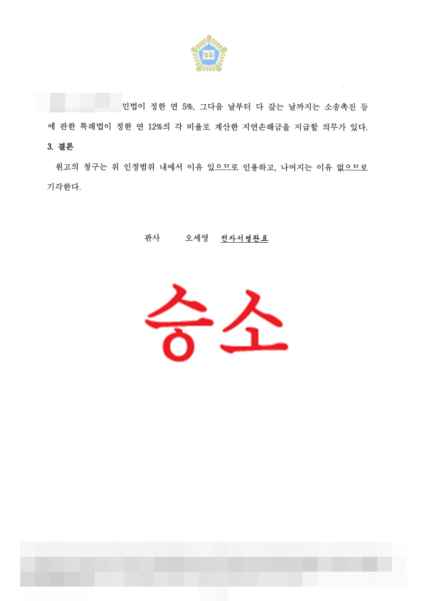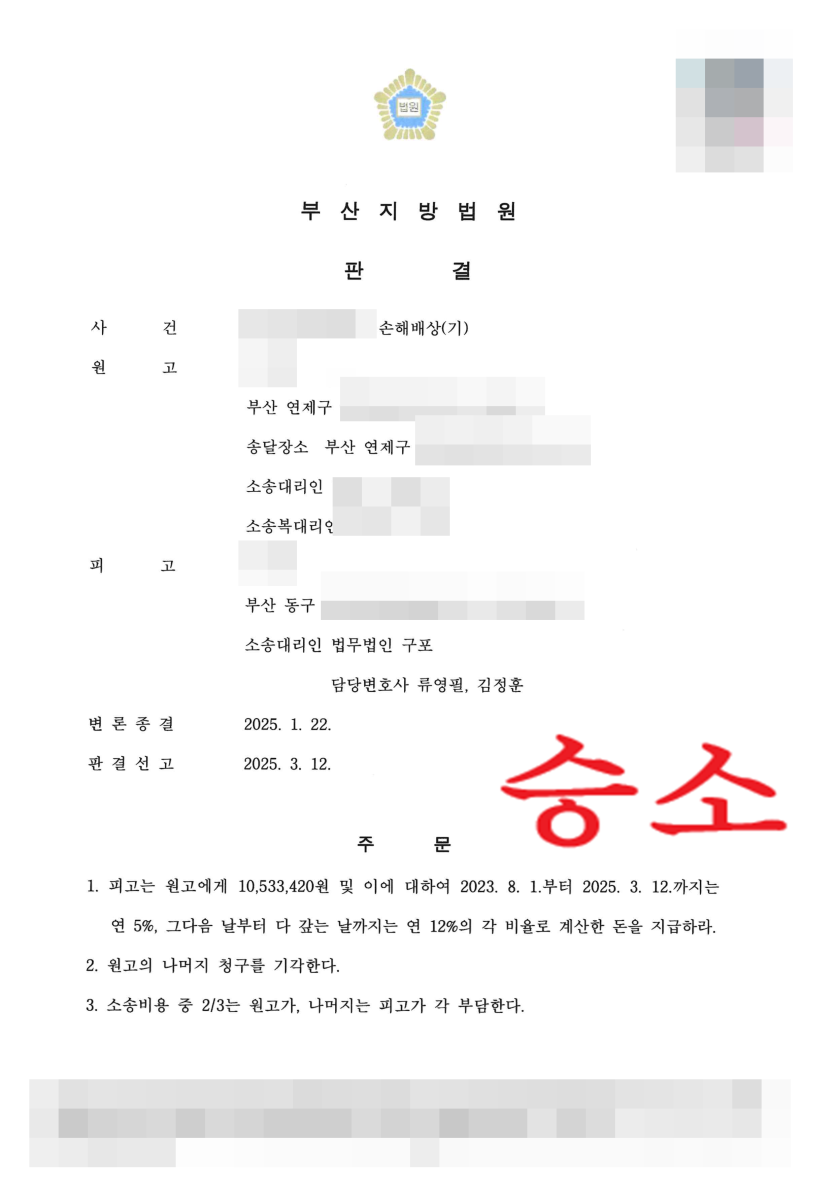 결국 재판부는 우리 의뢰인의 주장을 충분히 수용하여, 상대방인 원고의 청구 가운데 2/3을 배척하고, 1/3만을 인용하는 판결을 하였습니다.