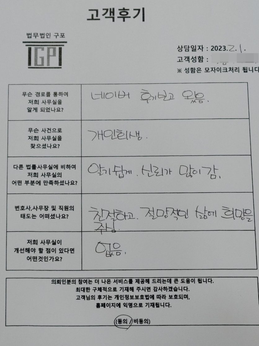 클릭해서 더보기 => (개인회생 방문상담) 의뢰인분의 실제 고객후기 페이지 정보 최고관리자 작성일23-02-03 목록 본문 안녕하세요. 법무법인 구포입니다.오늘도 법무법인 구포에 방문해주셔서 감사합니다. 좋은 하루 보내세요^)^ 목록
