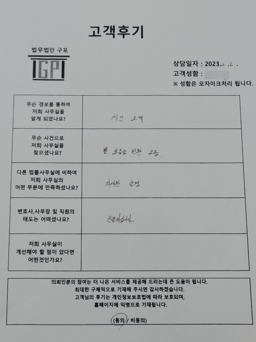 클릭해서 더보기 => 민사(보증금반환소송 방문상담) 의뢰인분의 실제 고객후기 페이지 정보 최고관리자 작성일23-02-06 목록 본문 안녕하세요. 법무법인 구포입니다.전세보증금반환소송 관련되어 내방해주셨습니다.좋은 결과 있으시길 바라겠습니다.감사합니다. 목록