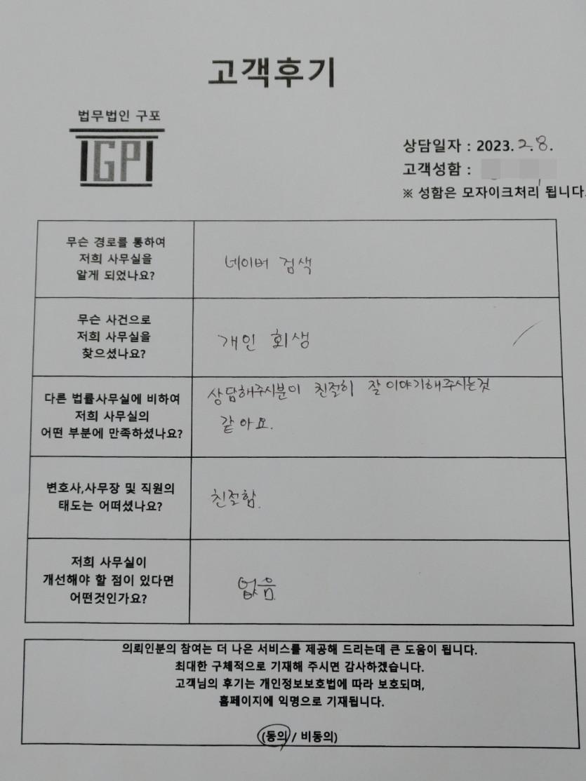 개인회생 신청 및 절차에 관해 법무법인 구포에 방문해주셨습니다.