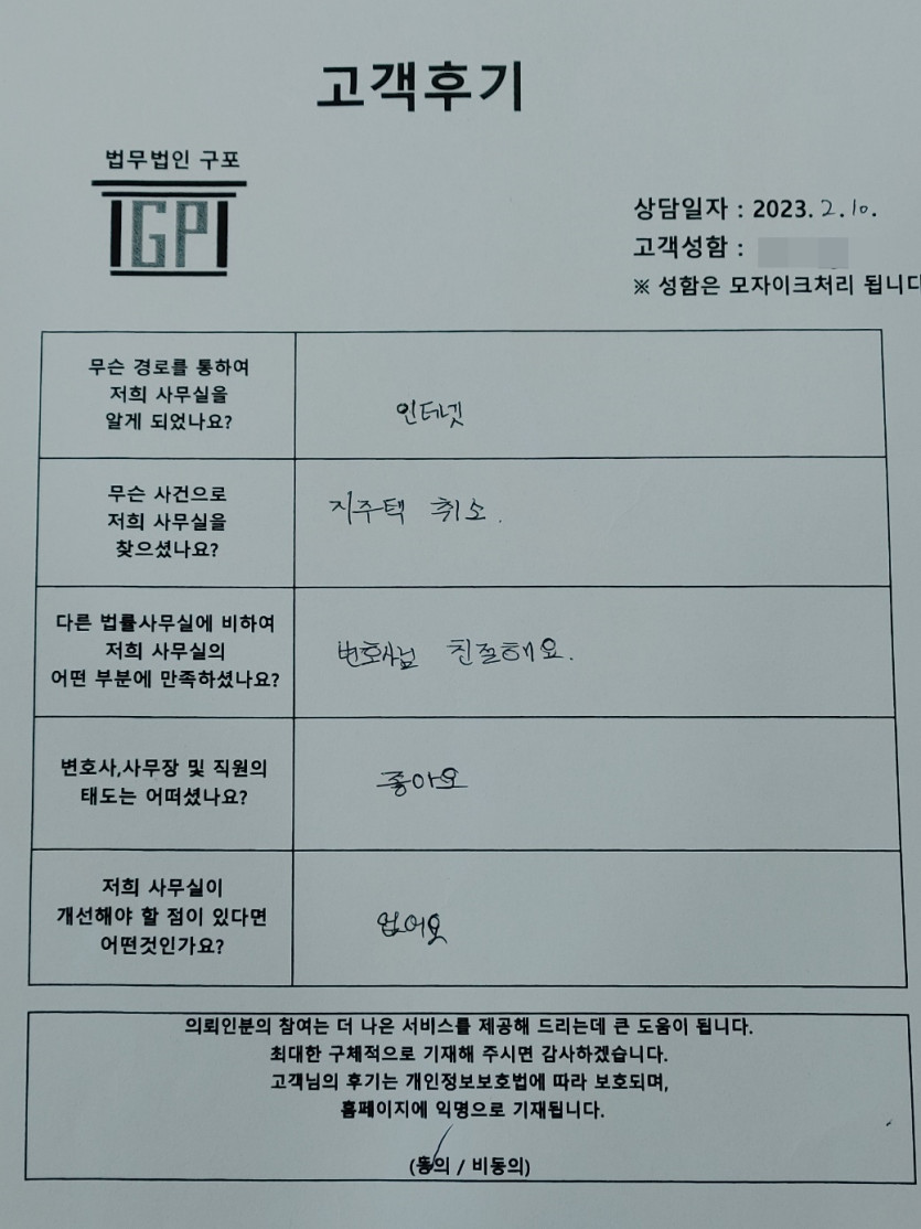 클릭해서 더보기 => 민사(지역주택조합(지주택)탈퇴 방문상담) 의뢰인분의 실제 고객후기 페이지 정보 최고관리자 작성일23-02-13 목록 본문 안녕하세요. 법무법인 구포입니다.지역주택조합(지주택)탈퇴 방문상담 의뢰인분의 실제고객후기 입니다. 목록