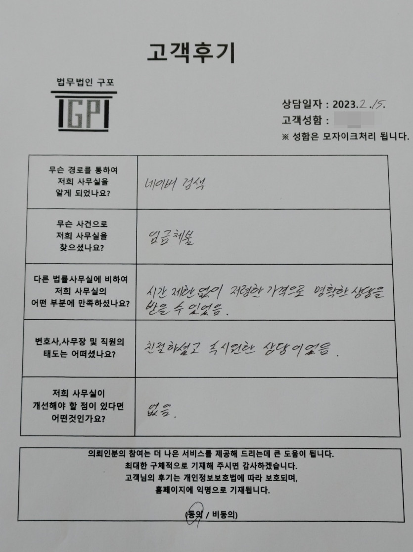 클릭해서 더보기 => 민사(임금체불 방문상담) 의뢰인분의 실제 고객후기