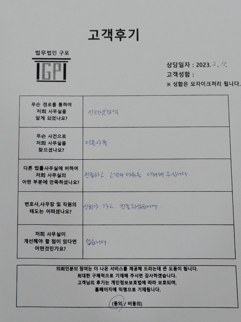 클릭해서 더보기 => 민사(이혼 방문상담) 의뢰인분의 실제 고객후기