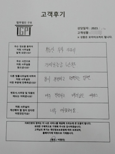 클릭해서 더보기 => 민사(전세금 계약 관련 방문상담) 의뢰인분의 실제 고객후기