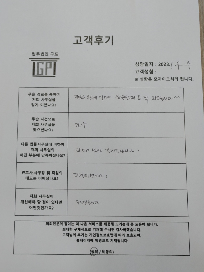 클릭해서 더보기 => <민사(민사소송 방문상담)> 의뢰인분의 실제 고객후기 페이지 정보 최고관리자 작성일23-01-04 목록 본문 안녕하세요.오늘도 추운 날씨에 저희 법무법인 구포에 방문해주셔서 진심으로 감사합니다. 목록