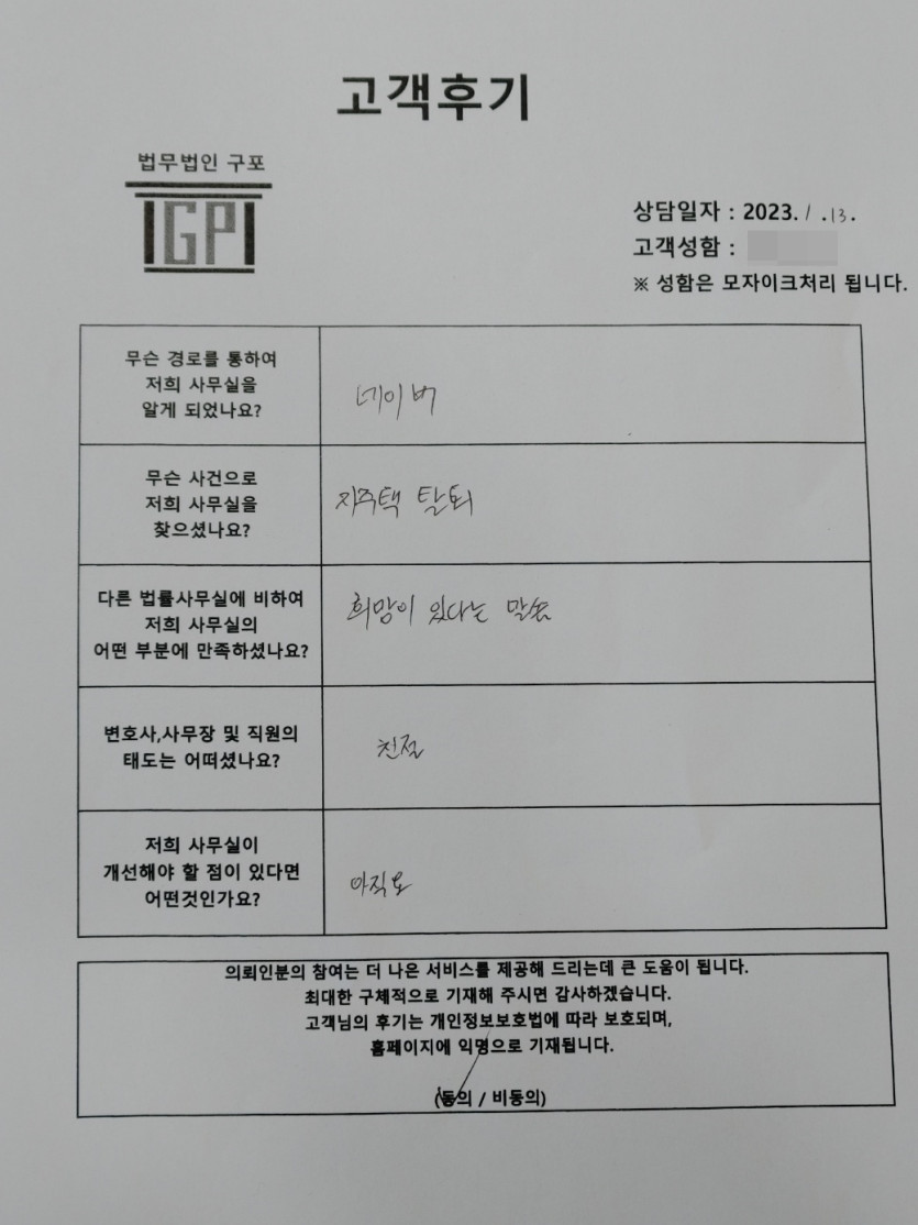클릭해서 더보기 => 민사(지주택,지역주택탈퇴 방문상담) 의뢰인분의 실제 고객후기