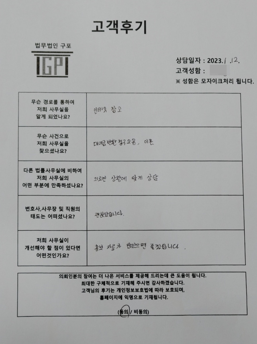 클릭해서 더보기 => 민사(대여금,이혼 방문상담) 의뢰인분의 실제 고객후기