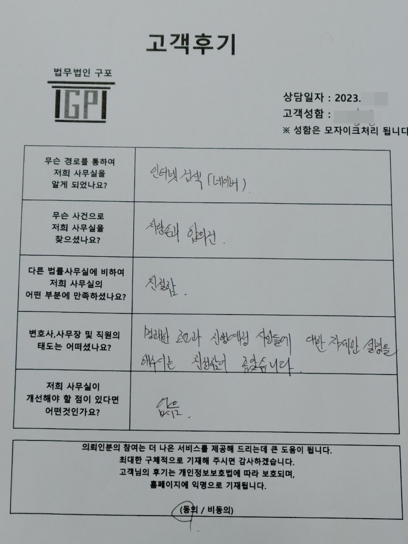 클릭해서 더보기 => 형사(차량손괴 합의 방문상담) 의뢰인분의 실제 고객후기 페이지 정보 최고관리자 작성일23-01-27 목록 본문 안녕하세요. 법무법인 구포입니다.차량손괴 합의 관련되어 상담을 요청해주셨는데추운날씨에 법무법인 구포에 방문해주셔서 진심으로 감사합니다. 목록