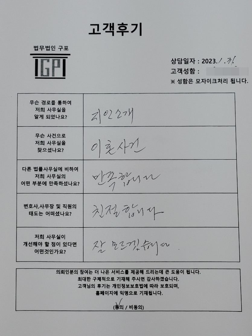 클릭해서 더보기 => 민사(이혼 방문상담) 의뢰인분의 실제 고객후기