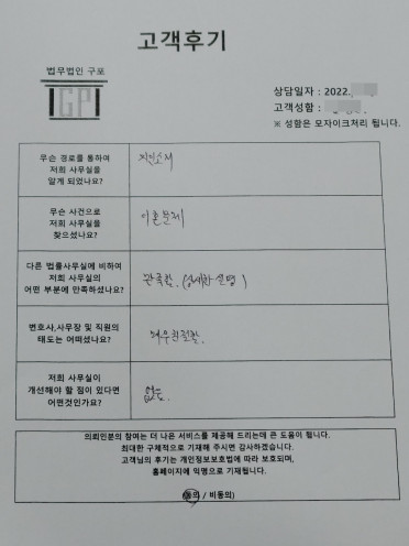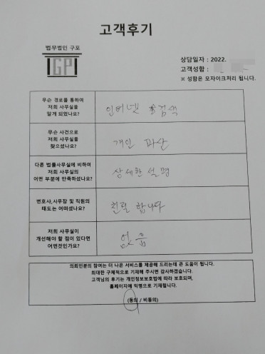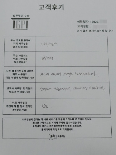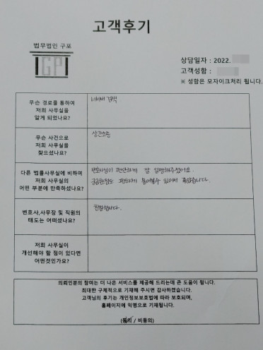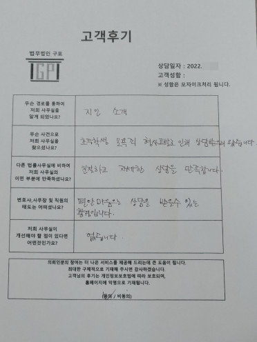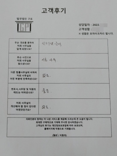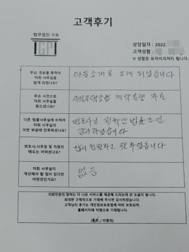 클릭해서 더보기 => 민사(이혼 방문상담) 의뢰인분의 실제 고객후기