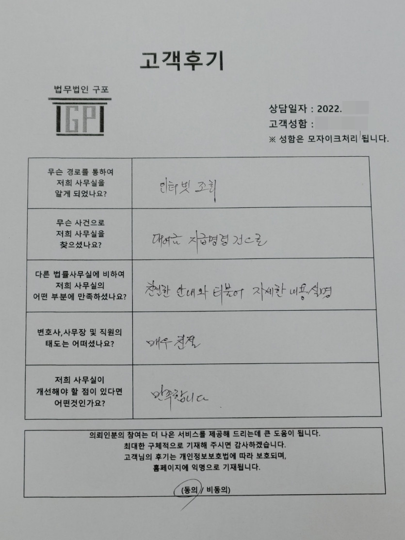 클릭해서 더보기 => 민사(대여금 지급명령 방문상담) 의뢰인분의 실제 고객후기
