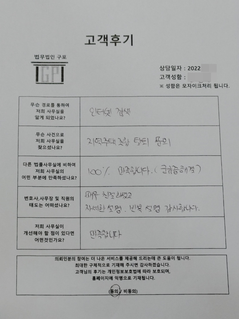 클릭해서 더보기 => 민사(지주택,지역주택탈퇴 방문상담) 의뢰인분의 실제 고객후기