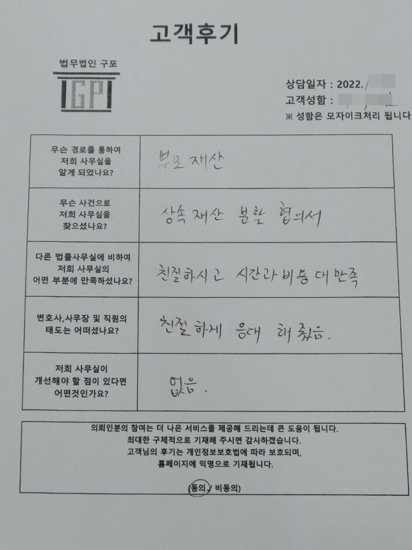 클릭해서 더보기 => < 민사(상속 방문상담) > 의뢰인분의 실제 고객후기