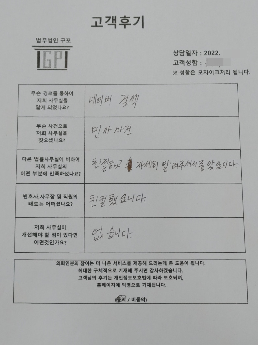 클릭해서 더보기 => <민사(소액민사 방문상담)> 의뢰인분의 실제 고객후기
