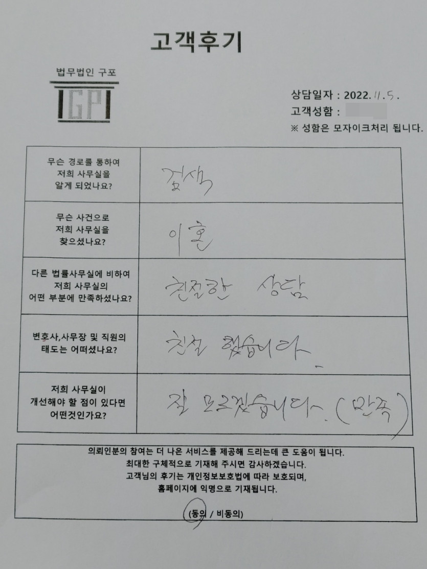 클릭해서 더보기 => < 민사 (이혼 방문상담) > 의뢰인분의 실제 고객후기