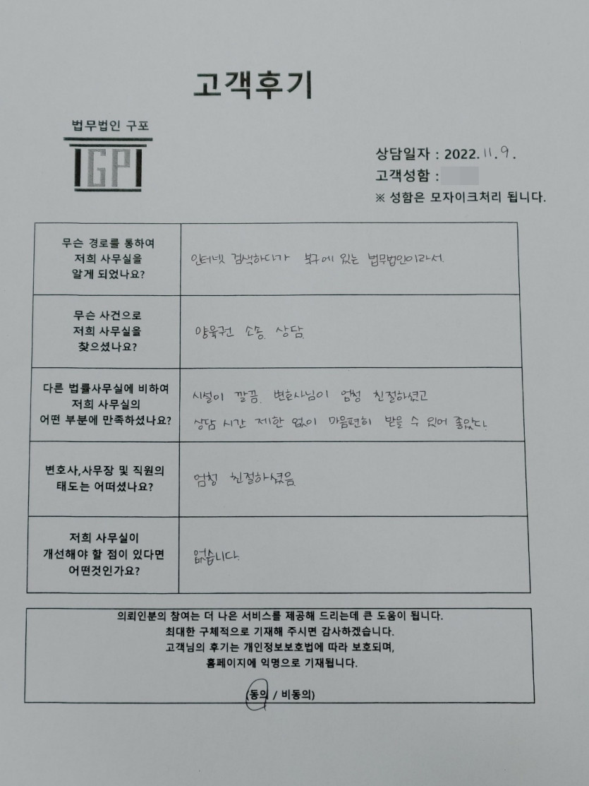 클릭해서 더보기 => < 민사(이혼 및 양육권소송 방문상담)> 의뢰인분의 실제 고객후기