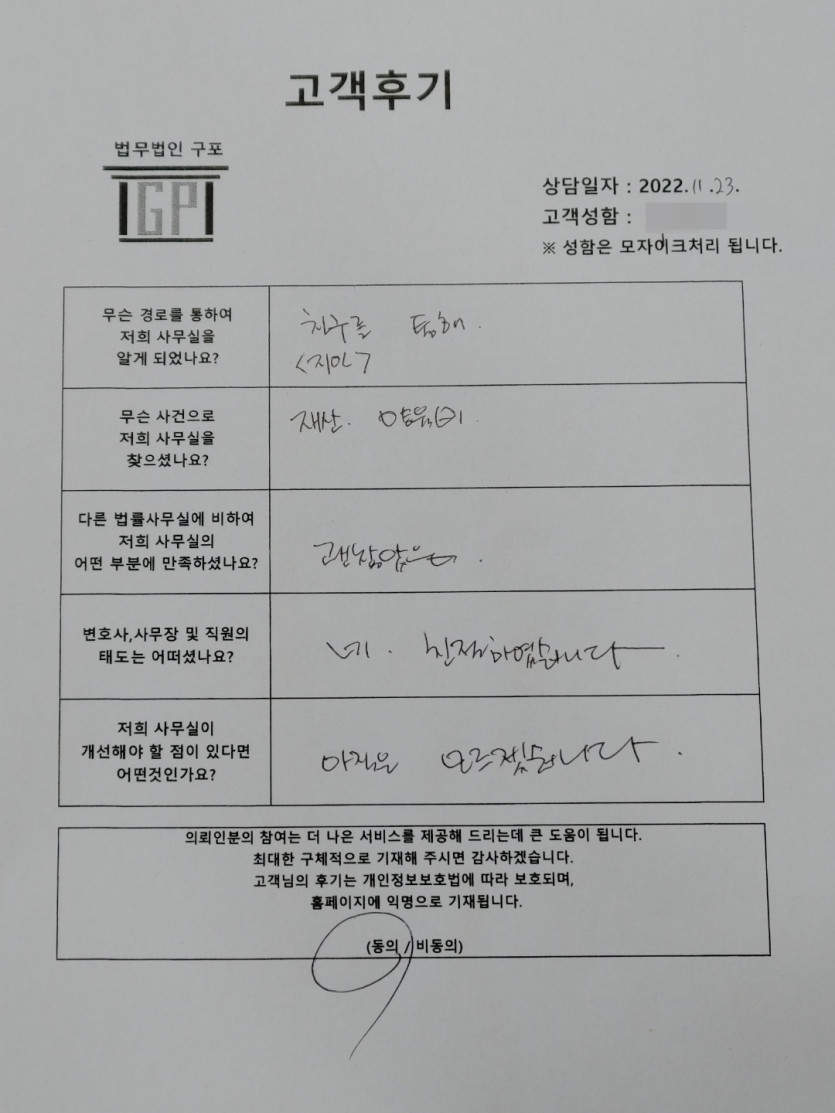 클릭해서 더보기 => 민사(이혼,재산분할,양육비관련 방문상담) 의뢰인분의 실제 고객후기