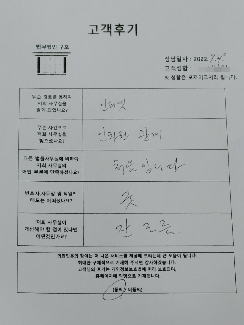 클릭해서 더보기 => < 민사 (임대차관련 방문상담) > 의뢰인분의 실제 고객후기 페이지 정보 최고관리자 작성일22-09-29 목록 본문 < 민사 (임대차관련 방문상담) > 의뢰인분의 실제 고객후기 (화면 확대조절 가능합니다.) 목록