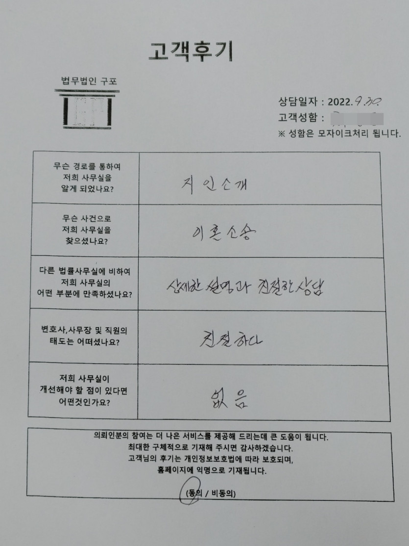 클릭해서 더보기 => < 민사 (이혼소송송 방문상담) > 의뢰인분의 실제 고객후기 페이지 정보 최고관리자 작성일22-09-30 목록 본문 < 민사 (이혼소송 방문상담) > 의뢰인분의 실제 고객후기 (화면 확대조절 가능합니다.) 목록