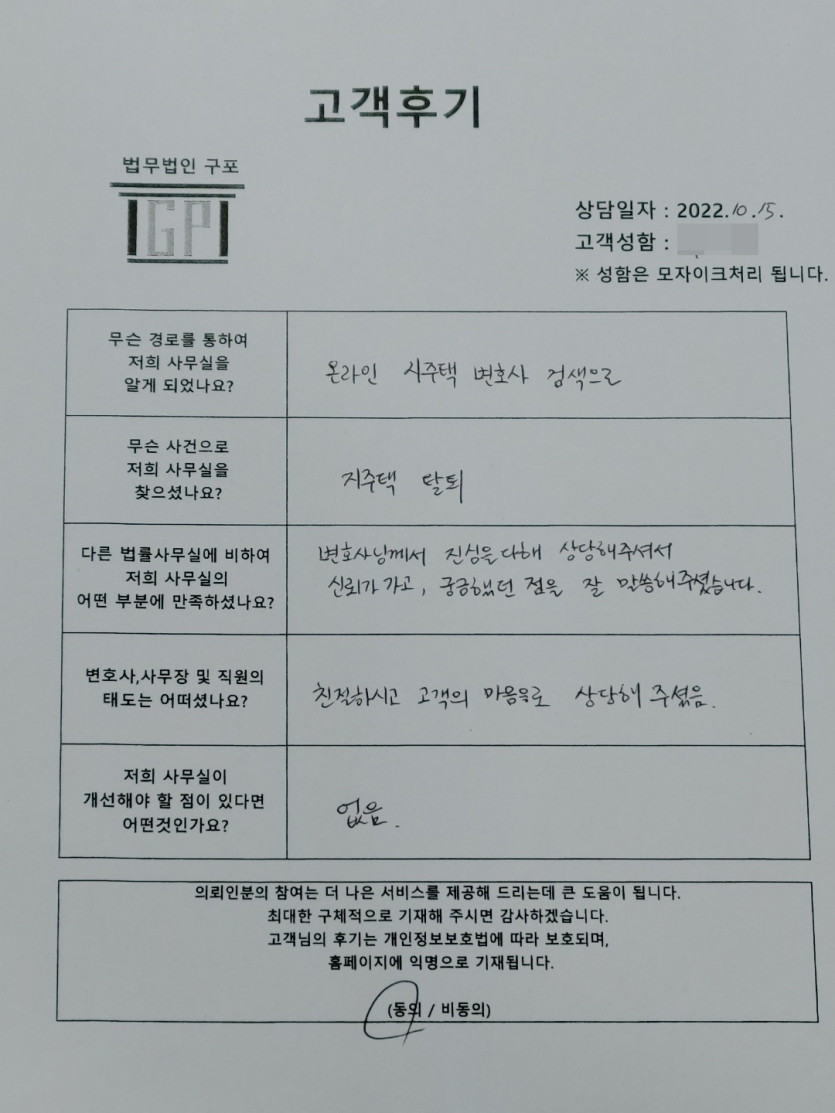 클릭해서 더보기 => < 민사 (지주택,지역주택조합 탈퇴) 방문상담) > 의뢰인분의 실제 고객후기