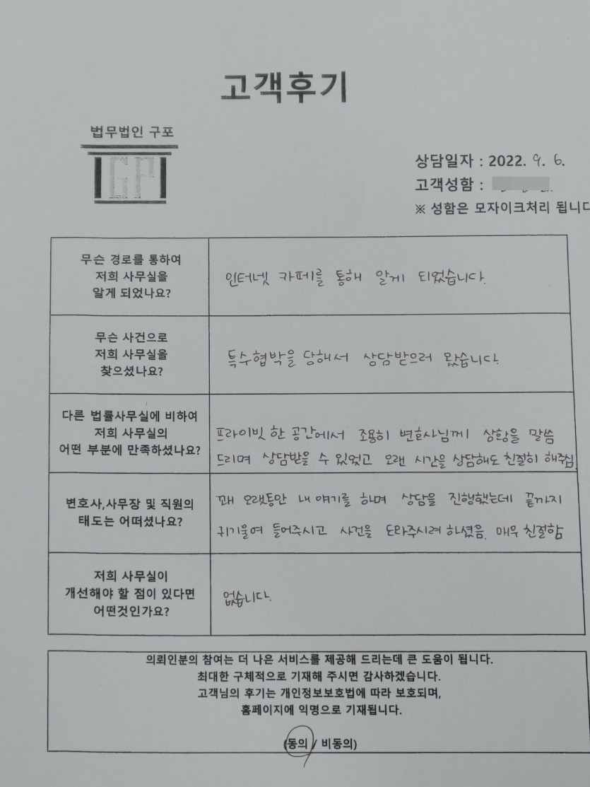 클릭해서 더보기 => <형사 (특수협박죄 방문상담) > 의뢰인분의 실제 고객후기 페이지 정보 최고관리자 작성일22-09-06 목록 본문 <형사 (특수협박죄 방문상담) > 의뢰인분의 실제 고객후기 (화면 확대조절 가능합니다.) 목록