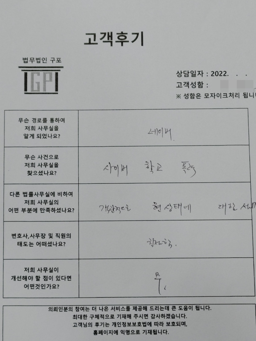 클릭해서 더보기 => < 형사 (사이버 학교폭력 방문상담) > 의뢰인분의 실제 고객후기 페이지 정보 최고관리자 작성일22-09-16 목록 본문 < 형사 (사이버 학교폭력 방문상담) > 의뢰인분의 실제 고객후기 (화면 확대조절 가능합니다.) 목록