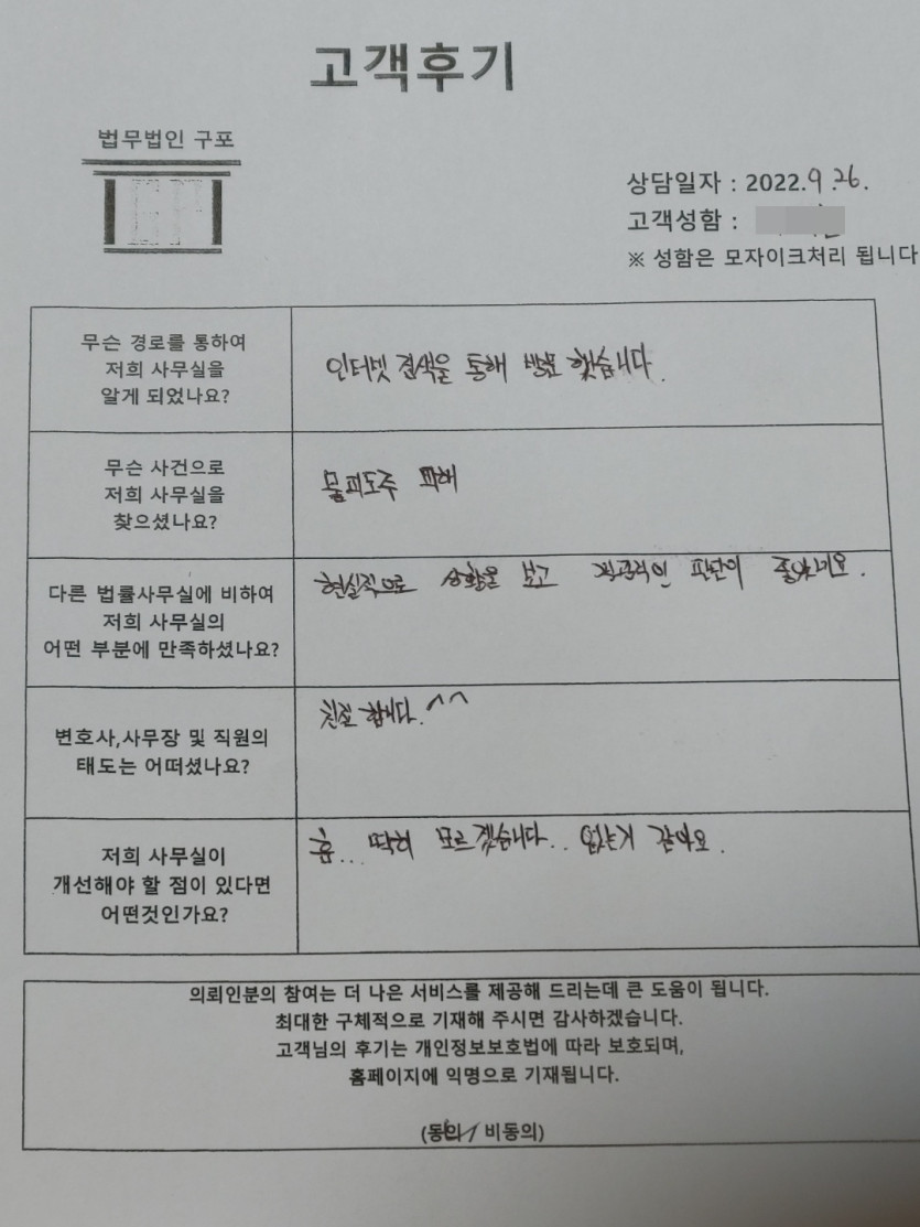 클릭해서 더보기 => <형, 민사(교통사고 방문상담) > 의뢰인분의 실제 고객후기 페이지 정보 최고관리자 작성일22-09-26 목록 본문 <형, 민사(교통사고 방문상담) > 의뢰인분의 실제 고객후기 (화면확대 및 조절 가능합니다.) 목록