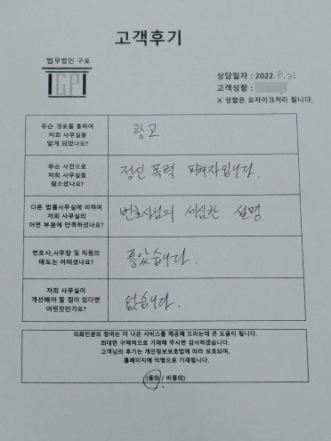 클릭해서 더보기 => < 민사 (데이트 폭력 소송) 방문상담 > 의뢰인분의 실제 고객후기
