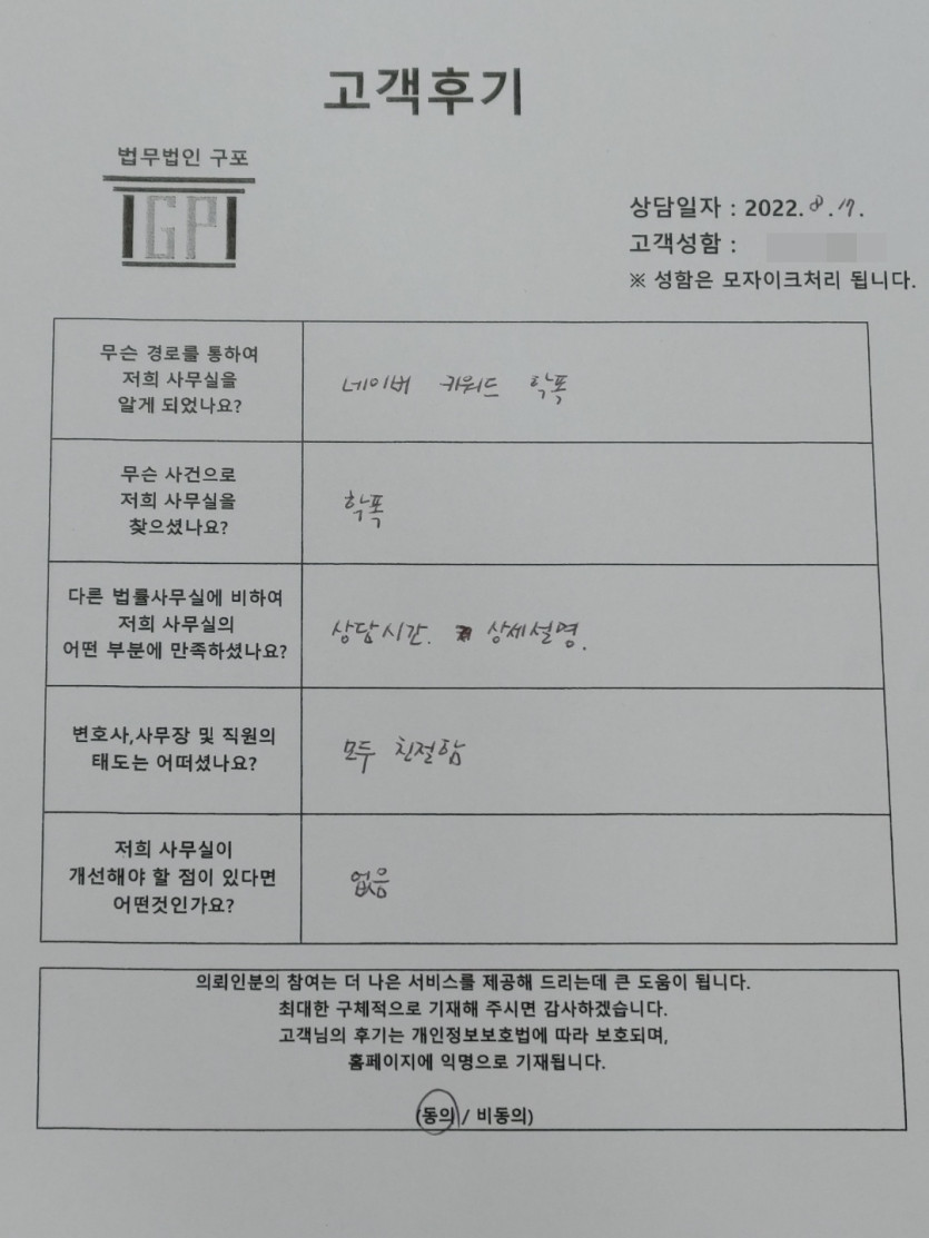 클릭해서 더보기 => <형, 민사 (학교폭력피해자) 방문상담> 의뢰인분의 실제 고객후기 페이지 정보 최고관리자 작성일22-08-17 목록 본문 <형, 민사 (학교폭력피해자) 방문상담> 의뢰인분의 실제 고객후기 (화면 확대조절 가능합니다) 목록