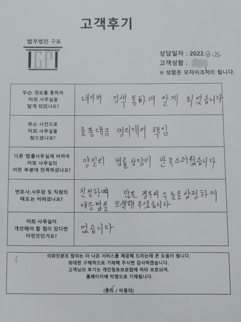 클릭해서 더보기 => <민사 (물품대금 명의대여 방문상담) > 의뢰인분의 실제 고객후기 페이지 정보 최고관리자 작성일22-08-25 목록 본문 <민사 (물품대금 명의대여 방문상담) > 의뢰인분의 실제 고객후기 (화면 확대조절 가능합니다.) 목록