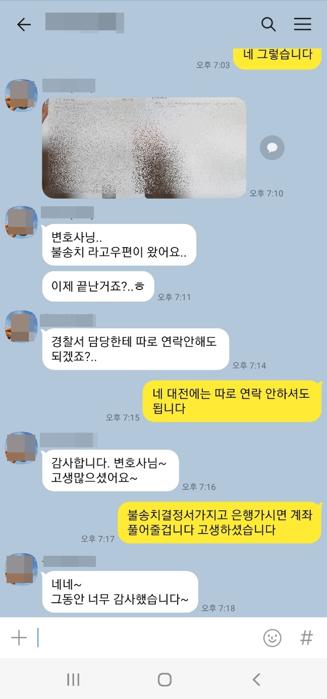 클릭해서 더보기 => <형사(사기 및 보이스피싱) 의뢰인분의 사건종결 카톡후기> 페이지 정보 최고관리자 작성일22-08-04 목록 본문 무사히 불송치 사건이 종결 되어 다행입니다. 그동안 고생 많으셨습니다. 법무법인 구포 변호인분들을 항상 믿어 주시고 기다려주셔서 감사합니다. 목록